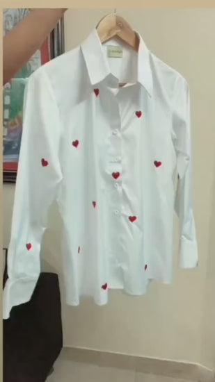 Made from soft, breathable fabric, this shirt combines classic tailoring with whimsical details. Scattered red heart embroidery brings a romantic twist to a clean, minimal aesthetic—making it a standout piece for brunch dates, office chic, or weekend getaways.