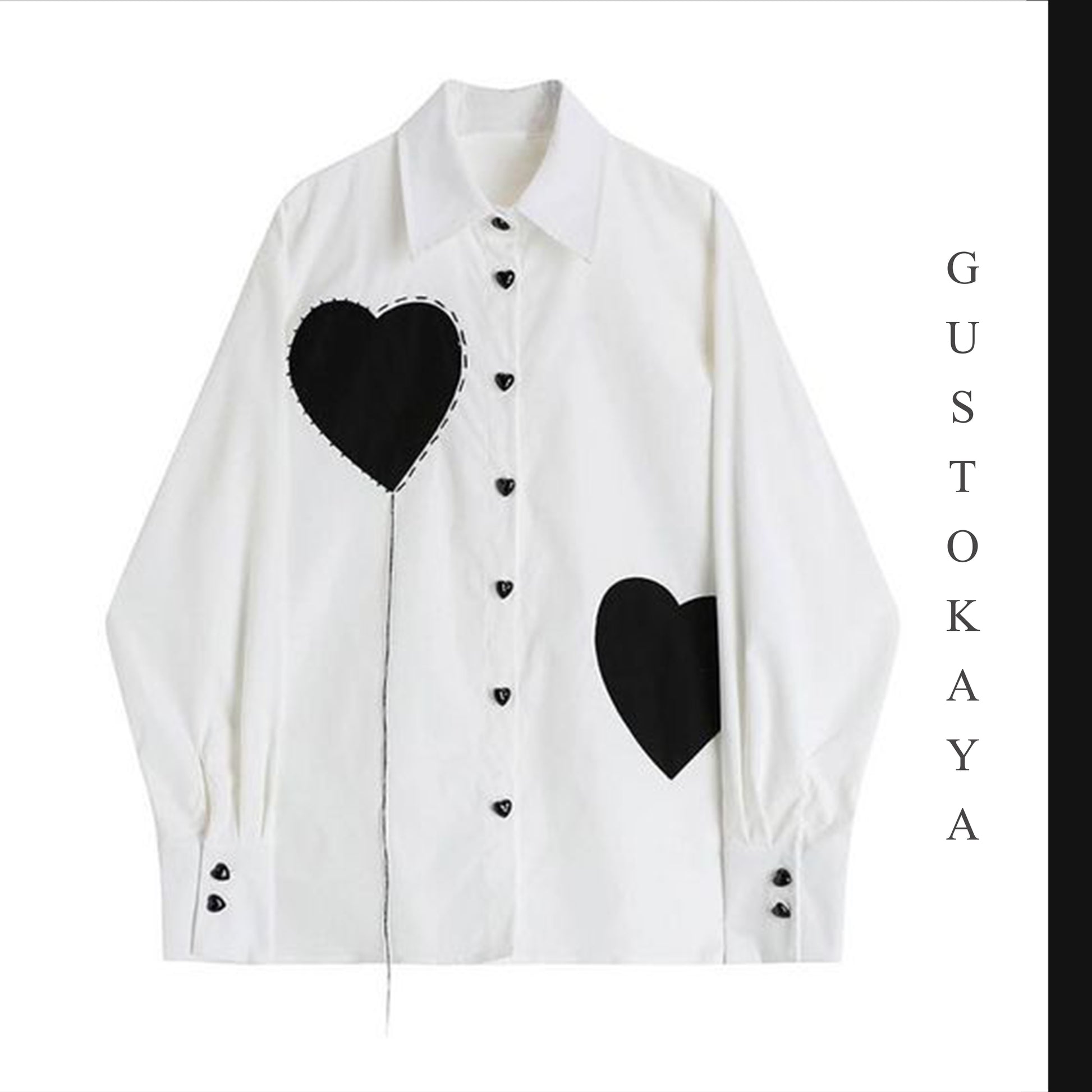 Buttons: Heart-shaped black buttons along placket and cuffs