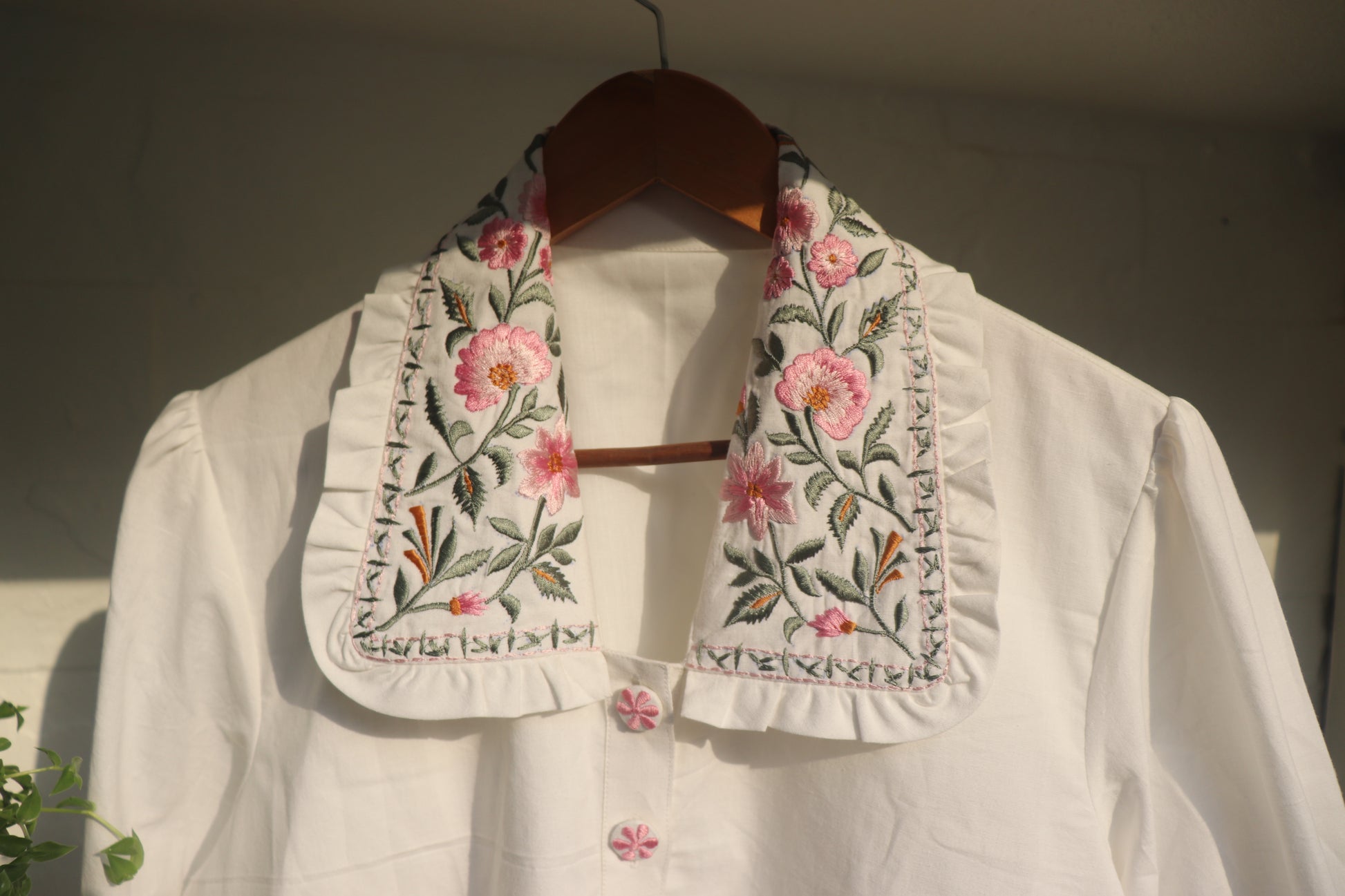 White Cotton Shirt with Hand Embroidered Floral Collar Details